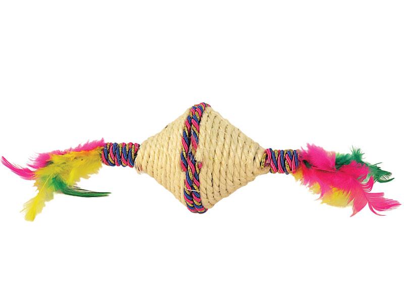 Wykonana została z naturalnego sizalu – pozyskiwanego z włókien agawy, który jest odporny na wbijanie pazurków i gryzienie. Po obu końcach umieszczono pierzaste kępki z piór, które z pewnością zainteresują kociego pupila. Warto pamiętać o regularnym kontrolowaniu stanu zabawek. Jesli stwierdzone zostaną uszkodzenia, warto wymienić produkt na nowy.